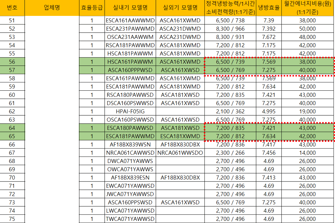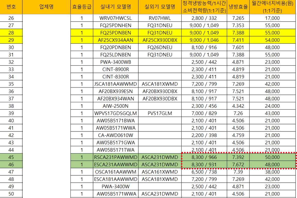 연달아서 표를 보여드렸는데 28번, 29번도 전력량, 냉방효율, 비용을 비교해보세요.