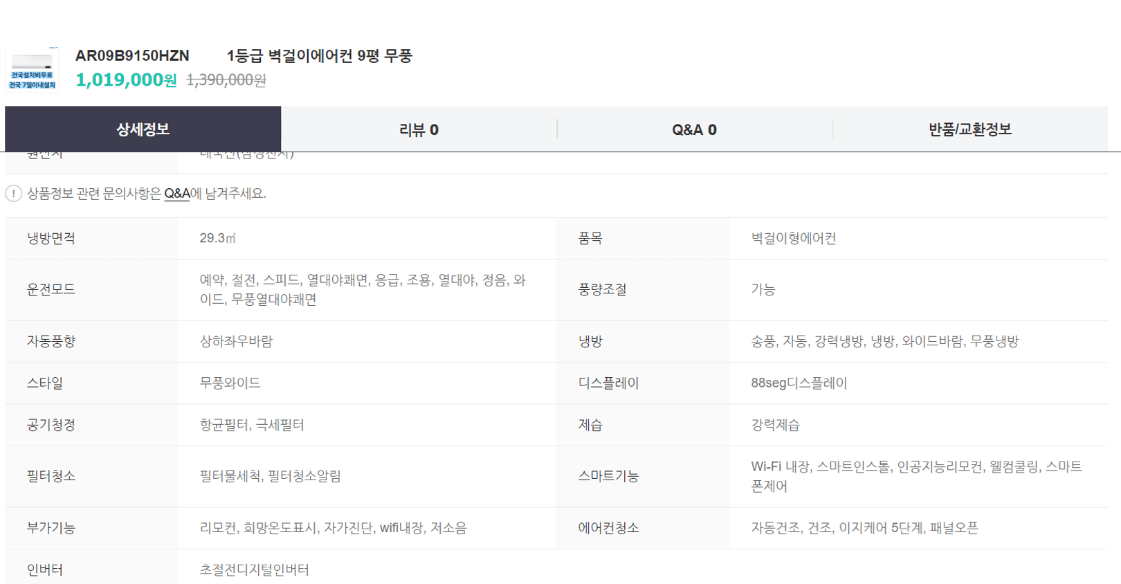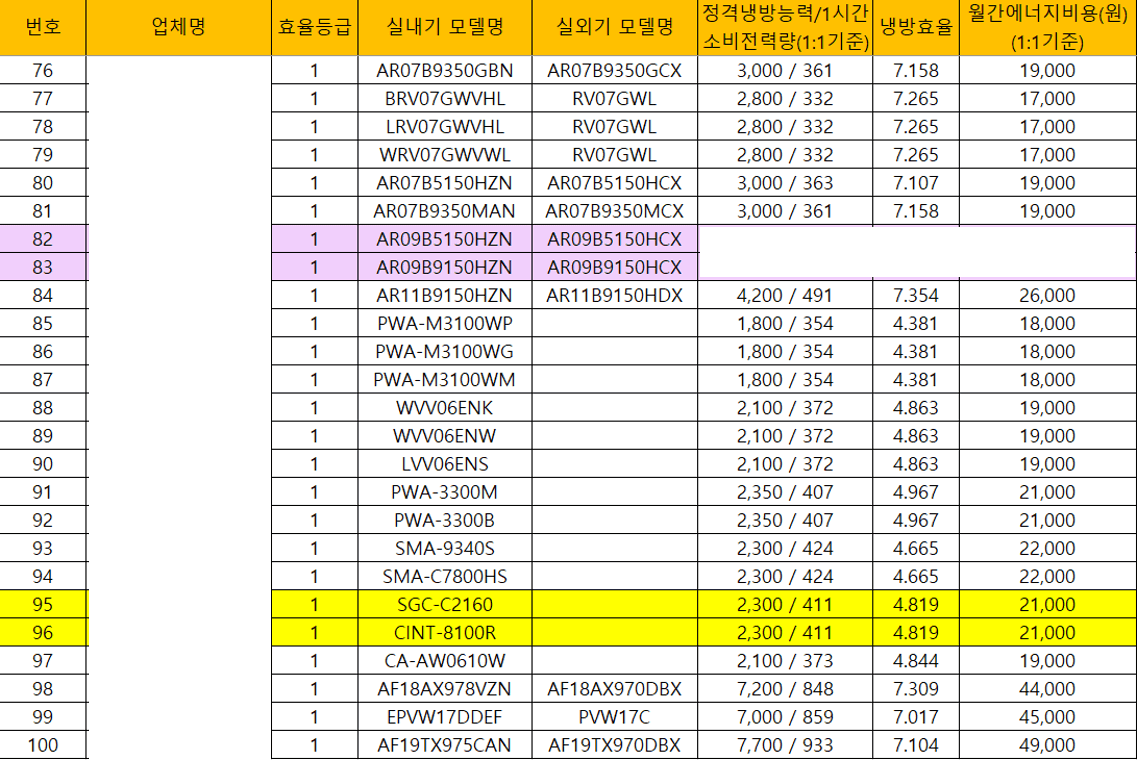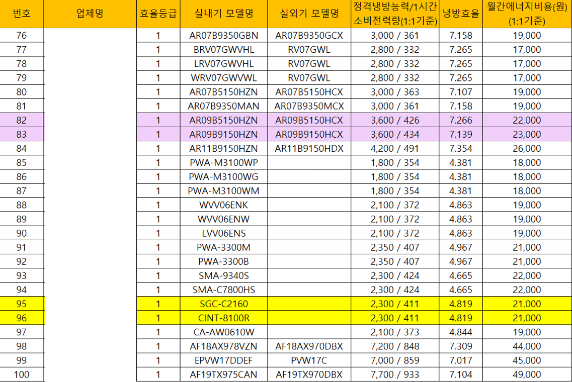 만약 냉방효율이 95번, 96번처럼 동일할 경우에는 본인이 원하는 부가 기능이 있는 제품을 선택하시면 됩니다.